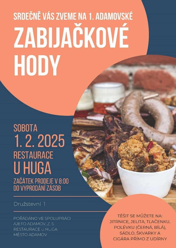 Srdečně Vás zveme na 1. Adamovské zabijačkové hody v sobotu 1.2.2025. Začátek prodeje v 8:00 v Restauraci U HUGA do vyprodání zásob. Těšit se můžete na: jitrnice, jelita, tlačenku, polévku (černou, bílou), sádlo, škvarky, cigáru přímo z udírny. Pořádáno ve spolupráci AJETO Adamov, z.s., Restaurace U HUGA, Město Adamov