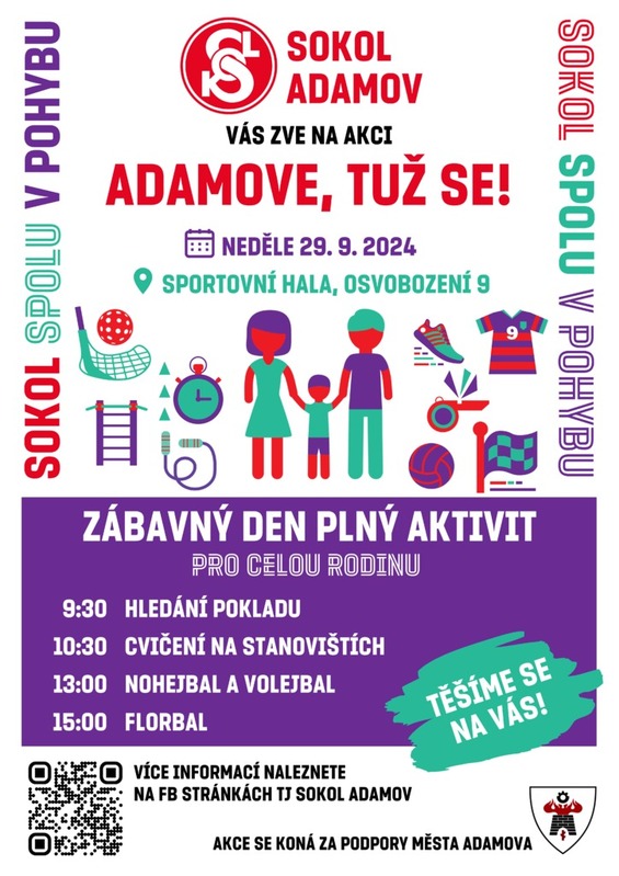 Tělocvičná jednota Sokol Adamov zve děti i dospělé na již 3. ročník akce Adamove, tuž se!, která se snaží představit sokolské aktivity v našem městě a podpořit radost z pohybu u široké veřejnosti. Akce se koná v neděli 29.9.2024 od 9:30 do 17:00 ve sportovní hale v Adamově. Program bude zahájen hledáním pokladu před halou a poté bude pokračovat uvnitř v tělocvičně cvičením na stanovištích, volejbalem, nohejbalem a florbalem. Tým organizátorů už se na vás těší. Více informací najdete na FB stránce TJ Sokol Adamov.