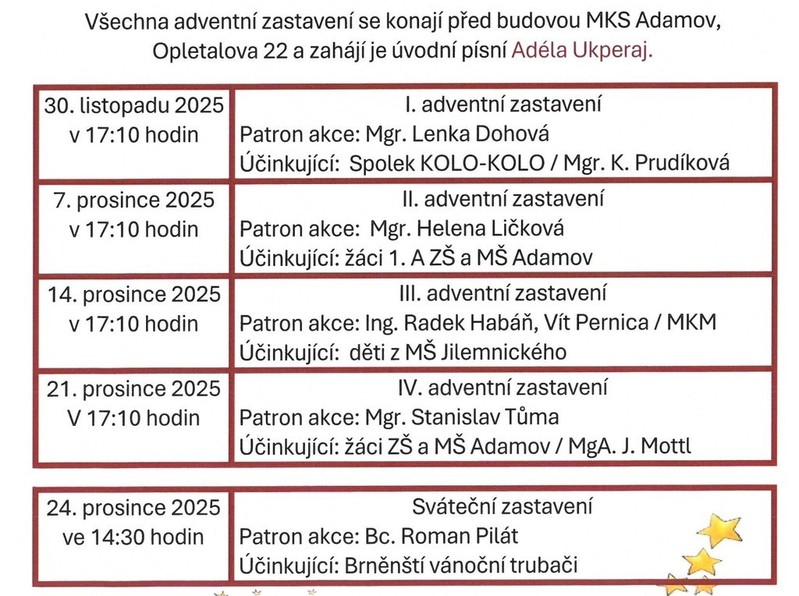 Také v letošním roce vás zveme na pravidelná adventní setkání... Opět se budou konat před budovou MKS Adamov každou adventní neděli od 17:10 hodin. Při třetím zastavení se můžete těšit na vystoupení dětí z MŠ Jilemnického a patrona, možná i dva - kluky z MKM Adamov,
