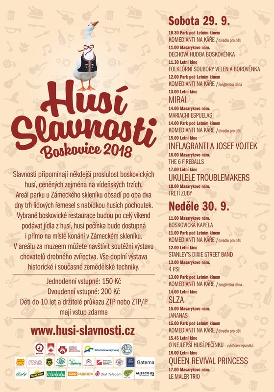 Slavnosti připomínají někdejší proslulost boskovických husí, ceněných zejména na vídeňských trzích. I letos se návštěvníci mohou těšit na dvoudenní programový blok v areálu Letního kina. Letošní novinkou se stane kulturní program na Masarykově nám., který bude pro všechny návštěvníky zcela zdarma.