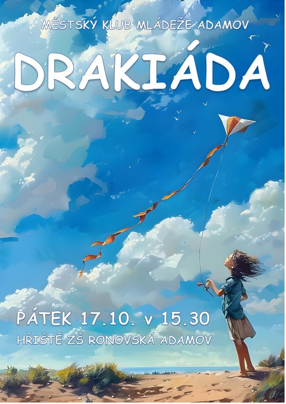 Městský klub mládeže vás zve na oblíbenou Drakiádu. Pouštění draků proběhne na hřišti za ZŠ Ronovská v Adamově. Adamovská drakiáda v pátek 17. října 2025 v 15.30.