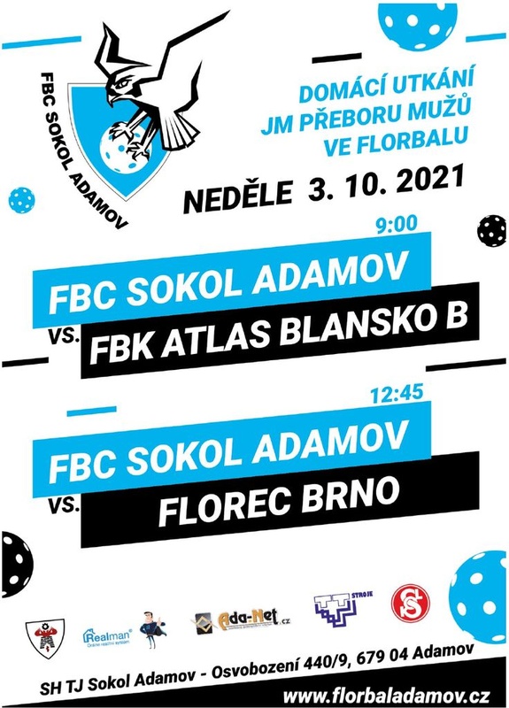 Florbalový oddíl FBC Sokol Adamov zve všechny své příznivce na domácí utkání našeho mužského týmu. Utkání se odehrají již tuto neděli 3.10.2021 v místní sportovní hale TJ Sokol Adamov.