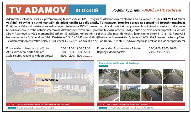 Adamovský infokanál vysílá v pozemním digitálním vysílání DVB-T z vysílače Alexandrova rozhledna a to na kanále 32 (SD i HD MPEG4 verze vysílání - obvykle je nutné manuální doladění kanálu 32 a dle značky TV nastavení formátu obrazu na ScreenFit či RoztáhnoutObraz).