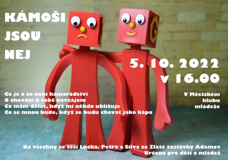 Přijď si povyprávět o tom, co je a co není kamarádství, o chování k sobě navzájem. Ve středu 5. října 2022 v 16 hodin v Městském klubu mládeže.