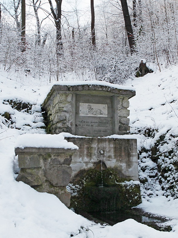 Studánka je postavena v bočním údolí v ostře zařízlé rýze. Byla zbudována v roce 1938, po 22 letech byla zrekonstruována. Studánka svojí existencí má připomínat zvíře, které žije ve společenství člověka už více než 10 tisíc let. Proto je na ní obrázek psa, jenž hlídá batoh, doprovozený citátem od Viktora Huga „Čím více poznávám člověčenstvo – tím více miluji psy“.