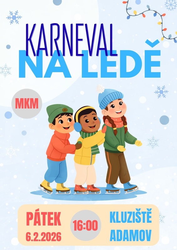 Městský klub mládeže v Adamově pořádá v pátek 6. února 2026 na kluzišti P. Jilemnického Karneval na ledě. Čekají vás veselé soutěže, tanec, odměny… Těšíme se na vás! Začátek v 16:00 hodin. Vstup zdarma. VSTUP NA LEDOVOU PLOCHU POUZE V BRUSLÍCH!