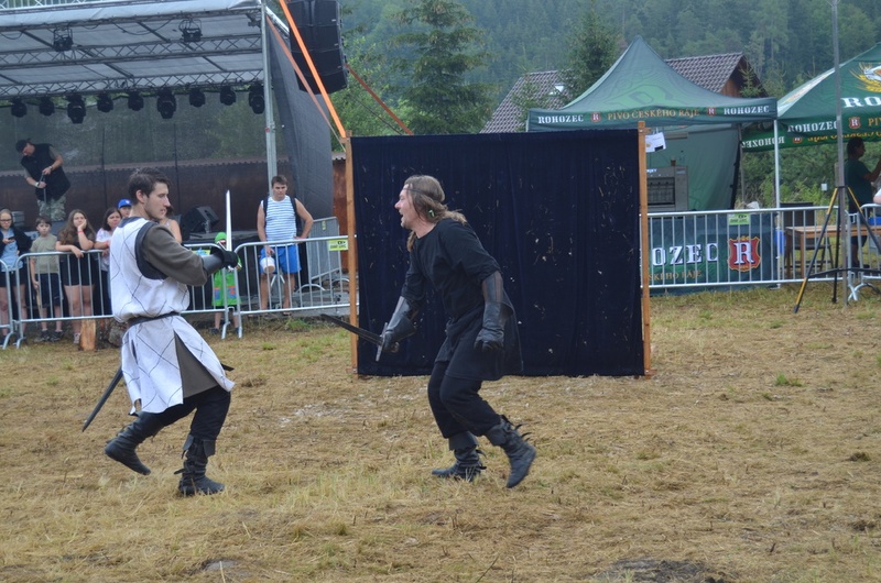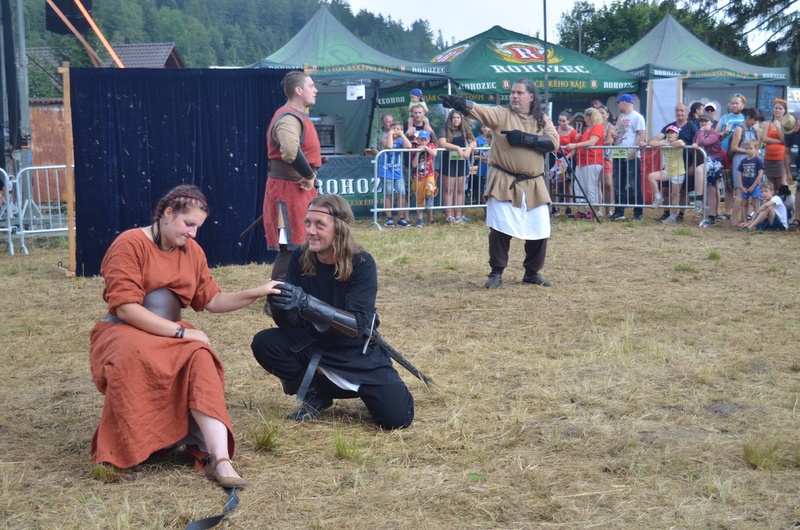 Po příjezdu do obce se nám bohužel začalo zhoršovat počasí, kterému jednu chvíli vévodila silná dešťová průtrž. I přesto jsme zvládli navštívit osvětlenou jeskyni Hladomornu, jež se nachází ve skalnatém vršku, kde se kdysi pyšně honosil holštýnský hrad. Dále jsme si prošli i samotné ruiny hradu. Kulturní program se skládal především ze šermířských vystoupení historické skupiny, která se těšila velkému zájmu návštěvníků.