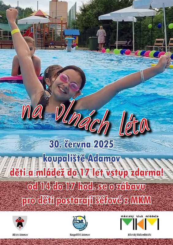 Městský klub mládeže se na jeden den přesouvá na koupaliště v Adamově – v pondělí 30. června 2025! Šéfové v roli plavčíků pro vás chystají spoustu zábavných vodních her a radovánek. Program klubu na koupališti začíná ve 14:00 a končí v 17:00. Vstup zdarma pro děti a mládež do 17 let.