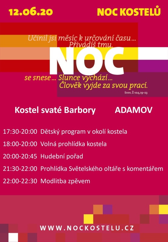Dvanáctá Noc kostelů v adamovském kostele svaté Barbory, která otevírá kulturní památku široké veřejnosti.