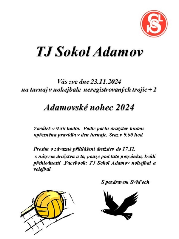 TJ Sokol Adamov pořádá dne 23.11.2024 nohejbalový turnaj smíšených družstev "Adamovské nohec 2024". Srdečně zveme i jednotlivce a družstvo složíme přímo na hale. Více informací v pozvánce.