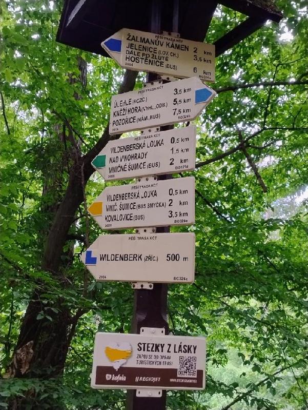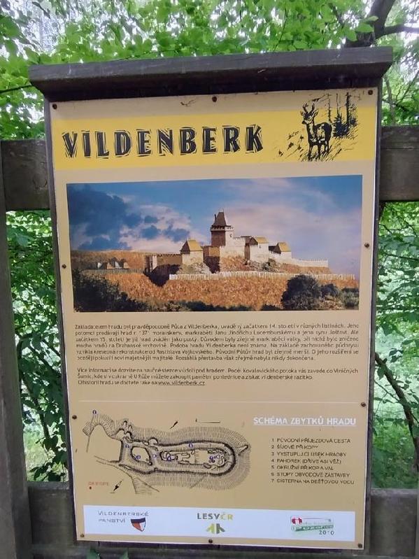 Rozcestník nabízel na výběr několik turistických tras. My jsme pokračovali dále po modré TZ směrem ke zřícenině hradu Vildenberk. Trasa vedla nadále lesem a pomalu se skláněla dolů. U dalšího rozcestníku se vydali někteří turisté k troskám středověkého hradu Vildenberk, který je dnes chráněný jako kulturní památka ČR a patřil ve středověku k největším na Moravě. Zde jsme přešli zase na žlutou TZ a Naučnou stezku Rékoví. Název pravděpodobně pochází z němčiny ze slova Rogengraben, což znamená srnčí příkop. Cesta klesala podél Kovalovického potoka až po točnu Viničné Šumice, kde jsme pěší cestu ukončili a autobusem odjeli do Brna.