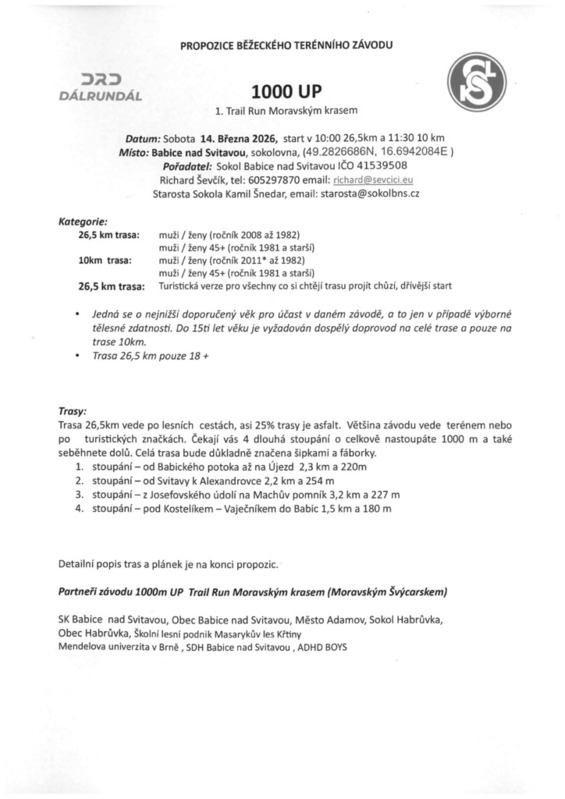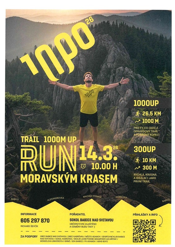 FK Adamov, z.s. jako jeden z pořadatelů akce srdečně zve na běžecký závod TRAIL RUN 1000 M UP Moravským krasem. Akce se koná 14.3.2026, start 10:00 hodin.