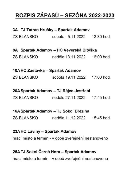 Spartak Adamov, z.s., hokejový oddíl zveřejňuje rozpis zápasů okresního přeboru v ledním hokeji.