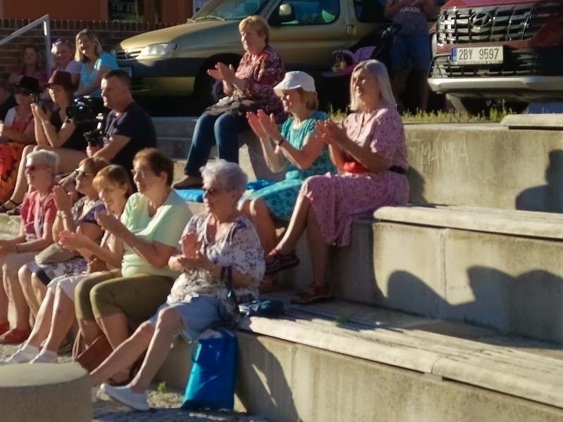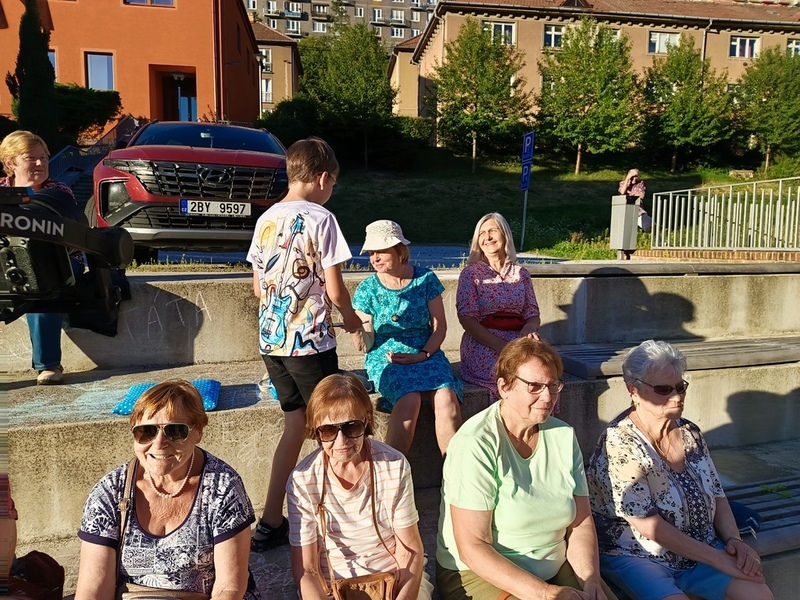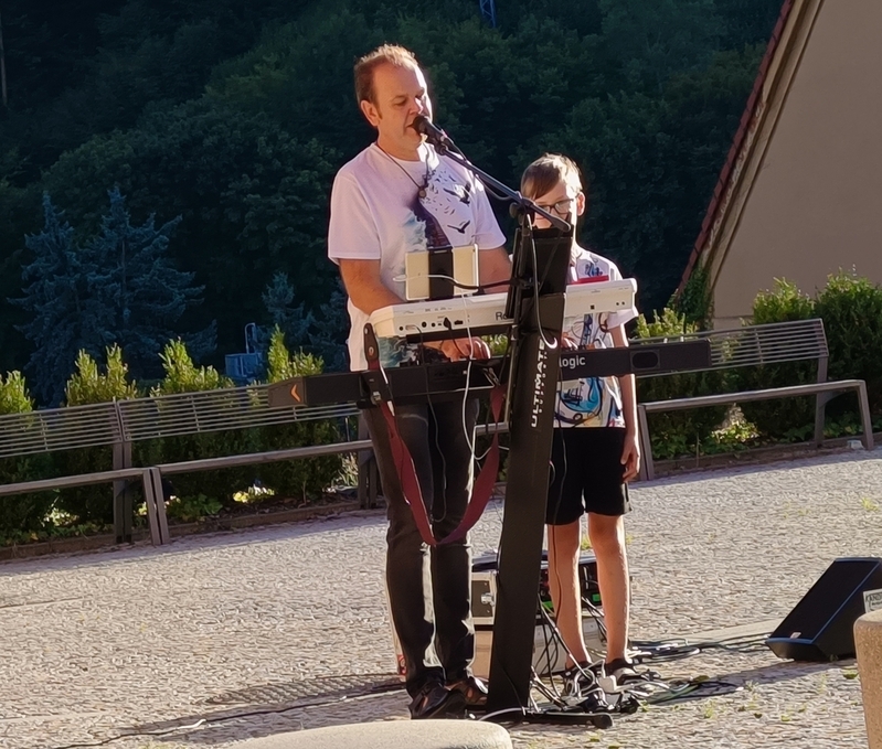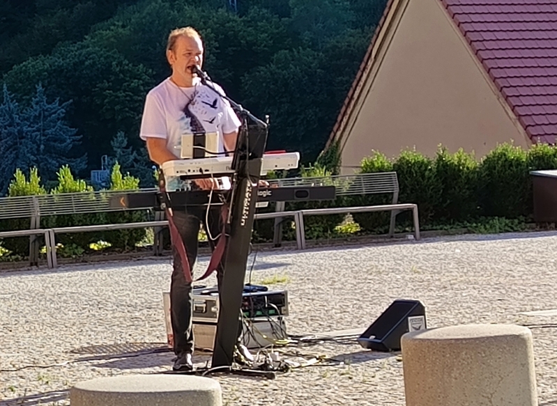 ... si pro návštěvníky připravil Petr Pedro Hurdes. Počasí nás opět pustilo na prostranství před kostel svaté Barbory v Adamově, a tak jsme si Petrovy autorské, ale i přejaté oblíbené písně mohli vyslechnout v tomto příjemném prostředí. Několikrát měl Petr posilu v podobě syna Lukáše. 19-08-2025