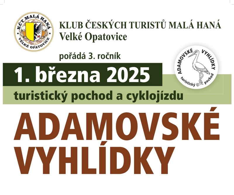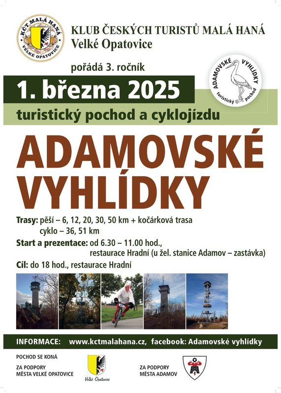Klub českých turistů Malá Haná Velké Opatovice pořádá 1. března 2025 turistický pochod a cyklojízdu Adamovské vyhlídky.