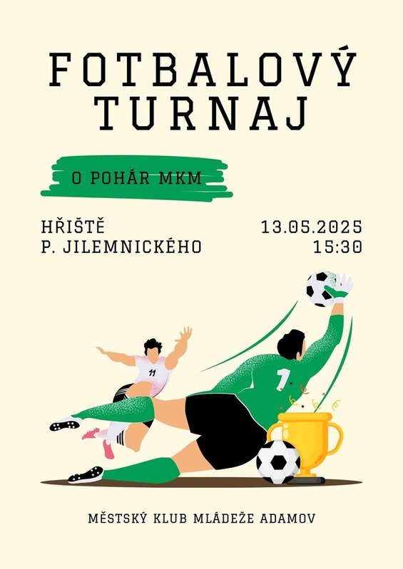 Městský klub mládeže pořádá turnaj v kopané. Soutěž pro pětičlenné týmy se uskutečnění v úterý 13. května 2025 v 15:30 na hřišti P. Jilemnického.