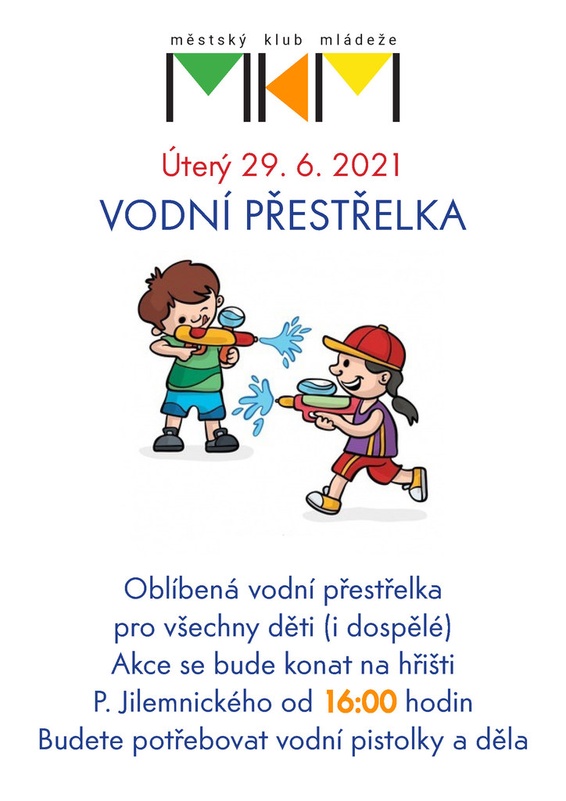 Městský klub mládeže pořádá dne 29. 6. 2021 od 16:00 hodin na hřišti Petra Jilemnického vodní přestřelku. S sebou si přineste vodní pistolky a děla a doma nechte vše, co by mohlo být vodou zničeno (mobilní telefony, hodinky..)