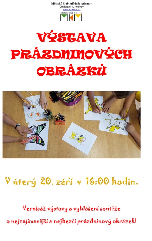 V úterý 20. září v 16:00 hodin se v Městském klubu mládeže v Adamově uskuteční vernisáž výstavy a vyhlášení soutěže o nejzajímavější a nejhezčí prázdninový obrázek!