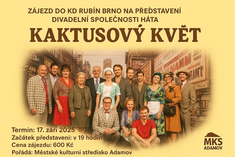 Pražská Divadelní společnost Háta přiveze do Brna komedii pod názvem Kaktusový květ. Uvede ji v kulturním domě Rubín, kam se na ni vypravíme i v rámci zájezdu pořádaného MKS Adamov. Termín: 17. září 2025, začátek: v 19 hodin Cena zájezdu: 600 Kč V hlavní roli Lukáš Vaculík Přihlášky na tel. 607 518 104